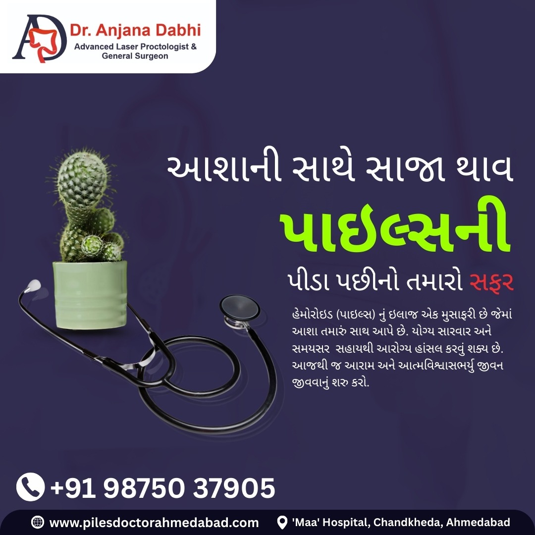 Best Piles Doctors in Ahmedabad | Dr. Anjana Dabhi. Looking for an experienced Piles doctor in Ahmedabad? Dr. Anjana Dabhi offers effective, compassionate, and patient-friendly treatment for piles (hemorrhoids)—helping you get back to a healthier, more confident life. We understand that piles (પાઇલ્સની) can disrupt your daily routine and affect your overall well-being. That’s why we provide safe, minimally invasive solutions tailored to each individual’s condition. From early diagnosis to complete care, Dr. Dabhi guides you through every step of your recovery journey. Start Your Journey Toward Healing “પીડા પછીનો તમારો સફર” (Your journey after pain) begins with a visit to a doctor who truly understands your concerns. With the right guidance, you can say goodbye to discomfort and start living a life full of confidence and comfort. “આશાની સાથે સાજા થાવ” (Heal with hope)—take the first step today. 📍 Visit Dr. Anjana Dabhi – Trusted Piles Doctor in Ahmedabad For appointments and consultation, reach out now and move toward lasting relief.