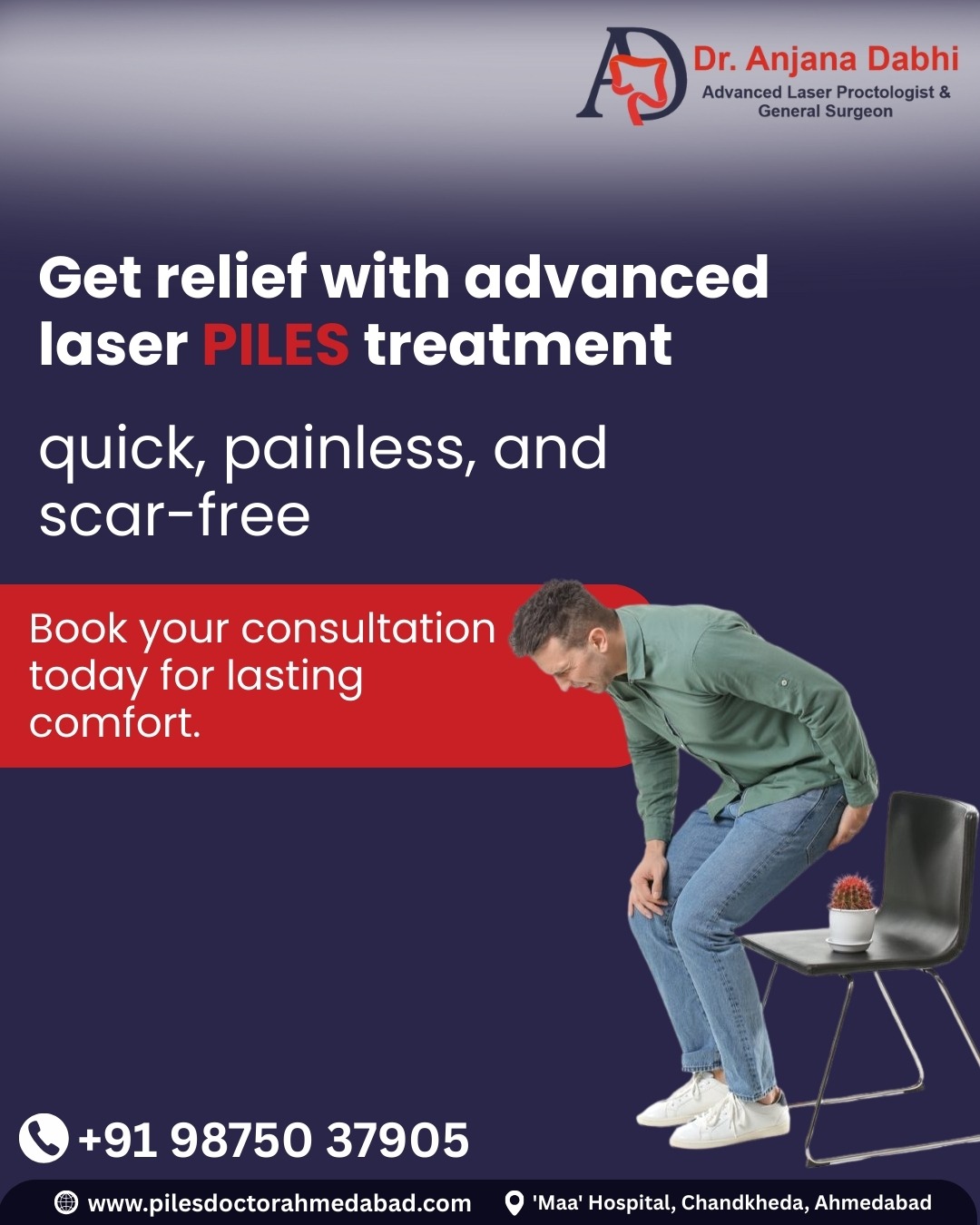 Piles Treatment in Ahmedabad. Living with piles can be painful, uncomfortable, and disruptive. At Dr. Anjana Dabhi, a renowned Chandkheda-based laser proctologist, we offer cutting-edge laser Piles Treatment in Ahmedabad designed for fast relief and long-lasting results. Our minimally invasive approach ensures that you can return to your routine quickly—without the pain, scars, or prolonged recovery time of conventional surgeries. Why Choose Laser Treatment for Piles? Laser technology has revolutionized how piles are treated. Unlike traditional methods, laser surgery involves no cuts or stitches, reducing the risk of infection and ensuring faster healing. Patients experience: Quick, same-day procedures Painless treatment with minimal bleeding No visible scars or stitches Rapid recovery and return to normal activities Trusted Piles Doctor in Chandkheda Dr. Anjana Dabhi has helped countless patients regain comfort and confidence with her expertise in advanced laser proctology. At her clinic in Ahmedabad, each patient receives personalized care, from accurate diagnosis to tailored post-treatment guidance. Contact us for details.